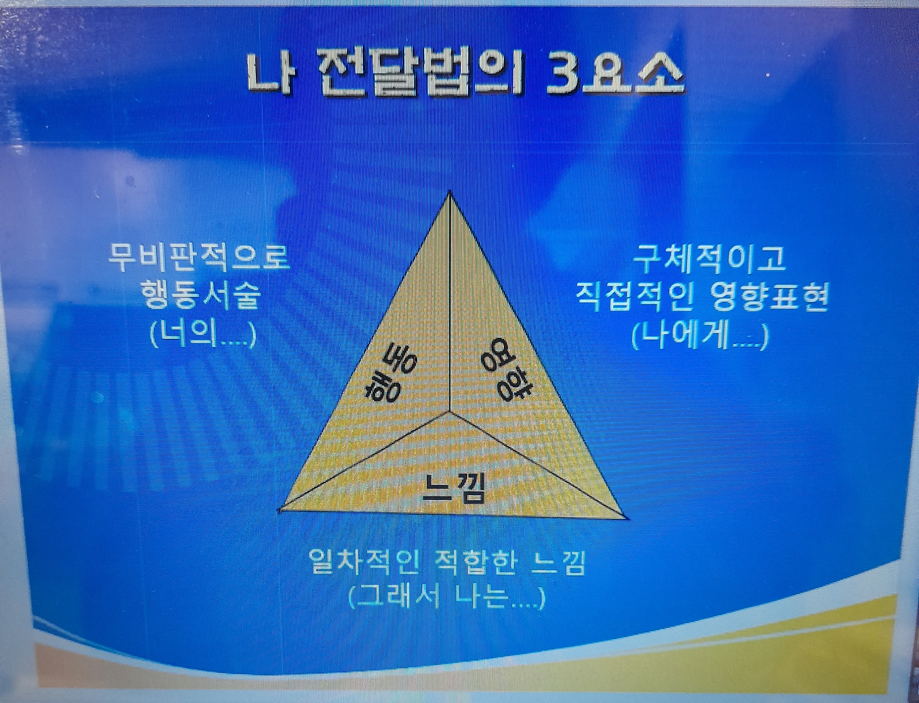 아들 너가 차에서 공을 가지고 노니 엄마가 운전하는데 차 사고 날까봐 걱정되! 라고 행동, 느낌 , 영향을 정확히 설명해 준다면 의사소통의 문제에서 서로를 배려하는 문장이라고 말씀하셧어요.